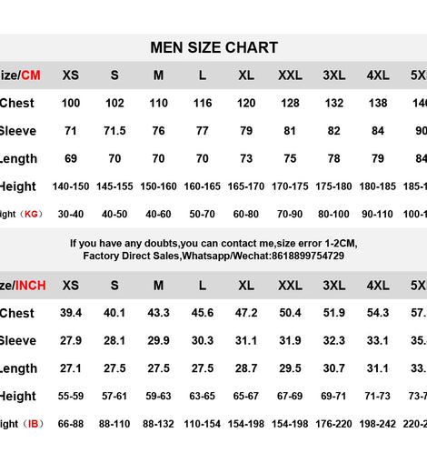 SPECIFICATIONS   Brand Name: NoEnName_Null   Choice: yes High-concerned chemical: None With Cap: Yes semi_Choice: yes   SIZE Chest (cm) Sleeve (cm) Length (cm) 0XL 122 83 75 1XL 128 83.5 76.5 2XL 1 34 84 78 3XL 140 84.5 79.5 4XL 146 85 81 5XL 154 85.5 82