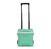 Designed with sturdy wheels and a locking, telescoping handle for easy push or pull transport and molded-in side handles for easy carrying, loading and unloading