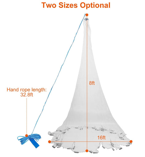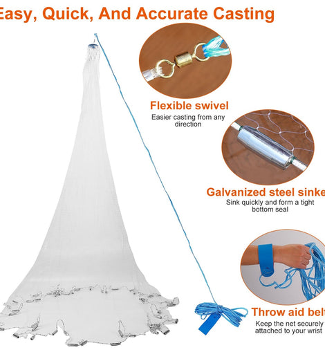 *Premium Net*:Made of premium monofilament material,the net is soft,tear-resistant,and long-lasting. It’s also relatively lightweight,which makes it much easier for you to throw the net at the desired position.