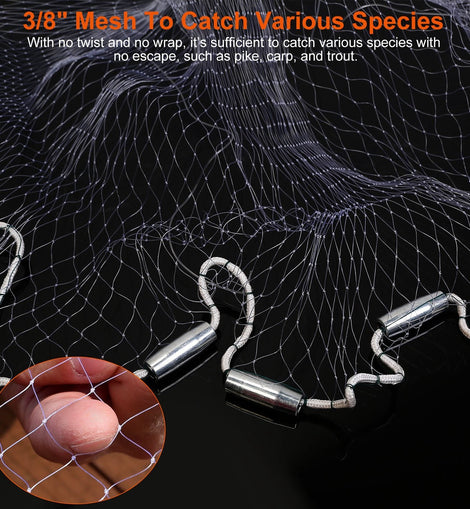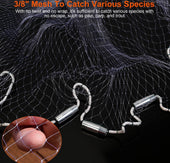 *3/8in Mesh Cast Net:The 3/8in mesh is sufficient to catch various species with no escape,such as pike,carp,and trout. Catch a large number of various fish with each net that you cast,easy and funny.