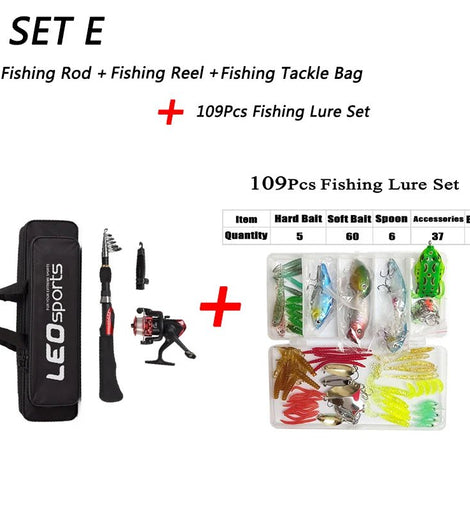 Set E: Fishing Rod+Reel +Bag +109Pcs Bait