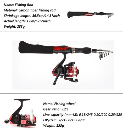 • Fishing Rod Full Kits 1.6M Telescopic Sea and Spinning Reel Baits Lure Tackle Travel Fishing Gear Accessories Bag 6 Optional Set