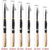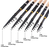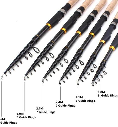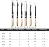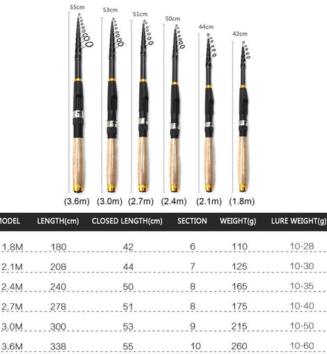 ![]() Telescopic Fishing Pole Carbon Fiber Portable Travel Fishing Rod Spinning Fishing Rod for Seawater Freshwater Bass Trout Fishing Feature: 1.Compact and Durable: This compact fishing rod is made from high-density carbon fiber with a 5-layer carbon cloth construction, ensuring its strength and durability. It can be easily carried as it shrinks to a size of 42cm-55cm. Refer to the product manual for more details. Specification: 1.8m - Length: 180cm/70.87in, Closing Length: 42cm/16.54in, Sections: 6, Weight: 110g, Lure Weight: 10-28g 2.1m - Length: 208cm/81.89in, Closing Length: 44cm/17.32in, Sections: 7, Weight: 125g, Lure Weight: 10-30g 2.4m - Length: 240cm/94.49in, Closing Length: 50cm/19.69in, Sections: 8, Weight: 165g, Lure Weight: 10-35g 2.7m - Length: 278cm/109.45in, Closing Length: 51cm/20.08in, Sections: 8, Weight: 175g, Lure Weight: 10-40g 3.0m - Length: 300cm/118.11in, Closing Length: 53cm/20.87in, Sections: 9, Weight: 215g, Lure Weight: 10-50g 3.6m - Length: 338cm/133.07in, Closing Length: 55cm/21.65in, Sections: 10, Weight: 260g, Lure Weight: 10-60g Origin: Mainland China